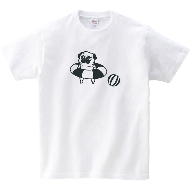 浮き輪の上に、寝転んだまま日焼けするパグちゃんが描かれたユニークなデザインで、パグ好きにはたまらないTシャツ。パグやブヒ好きな友達へのプレゼントとしてもおすすめです。カラーは2色から選べます。